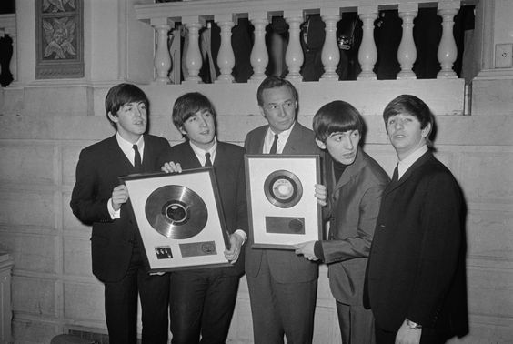 Alan Livingston (centre), president of Capitol Records, and the Beatles display gold records presented to the quartet on 10 February 1964.
