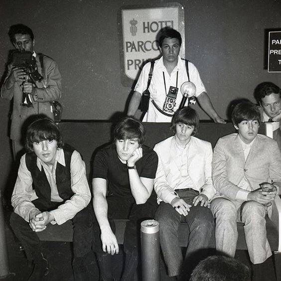 Beatles John Lennon continues to play the guitar as he evades a young fan who wants Lennon’s yachting-style cap as a souvenir during the Beatles concert in Rome, Italy, June 28, 1965. (AP Photo)