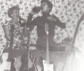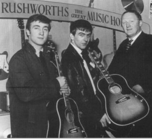 This is really a tale of two guitars. Harrison bought an electrified “jumbo” acoustic on 10 September 1962, the same day Lennon bought one, at Rushworth and Dreaper’s Music in Liverpool. (In photo at left, assistant manager James Rushworth poses with the lads.)
