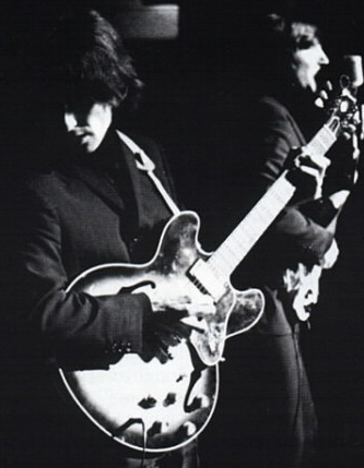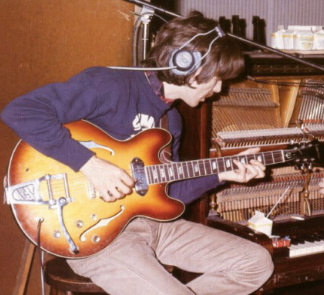 It’s been reported that one of the Moody Blues loaned this guitar to Harrison after his Country Gent was smashed on a roadway on 2 December ’65, but photos from the “Daytripper” and “We Can Work It Out” video session of 23 November show Harrison playing this guitar, so another myth bites the dust