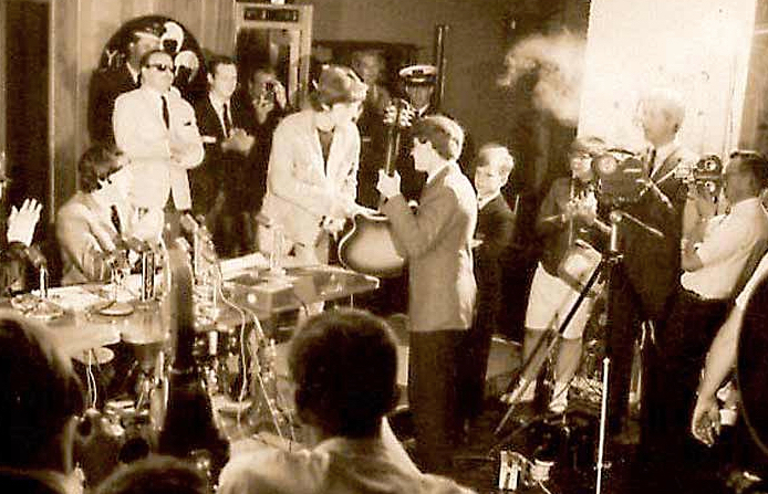 Radio station WDGY finally got its chance to give Harrison a guitar on 21 August 1965, when the Beatles came to Minneapolis. At a press conference (below) this “new style” 360-12 was hand-delivered from that city’s B-Sharp Music.