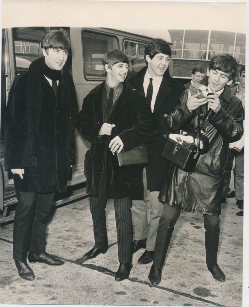 The Beatles who has strummed , sung and shaking their distinctive hair hair-cuts to fame in the world of "pop" during the last year , pictured this morning (wednesday) at London Airport before flying out for a series of engagements in Sweden