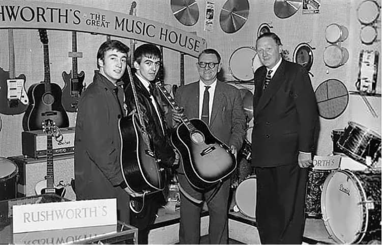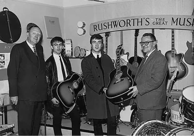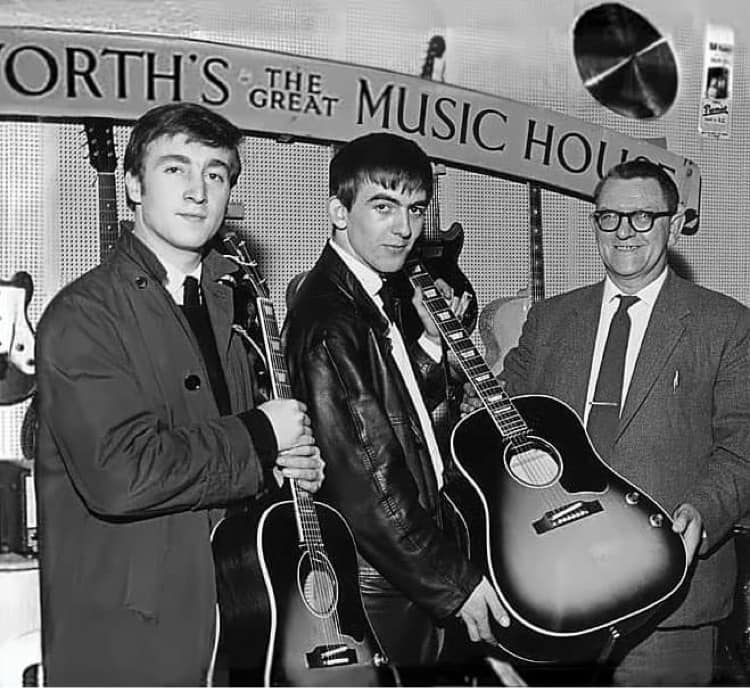 On September 10, 1962, Brian Epstein purchased two nearly identical Gibson J-160E acoustic-electric “Jumbo” guitars for John and George at Rushworth’s Music House in Liverpool. John used his guitar to co-compose such Beatles classics as “I Saw Her Standing There,” “She Loves You” and “I Want to Hold Your Hand.”