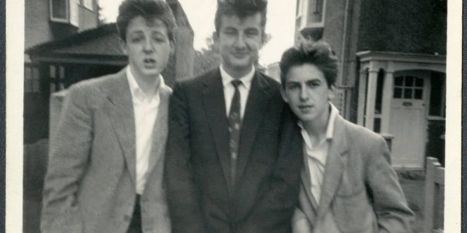 ~ “I’d been invited to see them play several times by Paul but for some reason never got round to it before.I remember being very impressed with John’s big thick sideboards and trendy teddyboy clothes. In a way, all that emotional rough stuff was simply a way for him to help separate the men from the boys, I think. I was never intimidated by him. Whenever he had a go at me I just gave him a little bit of his own right back.” Georgecourtesy Beatles BiblePeople disagree on the date that George first met the Quarrymen but George said that the first time he saw them was at the Wilson Hall, opposite the bus depot in Garston which Mark Lewisohn places at this date. Wonder if he got there on his Dad’s bus Image of George with Paul and Ivan Vaughan c 1958 from